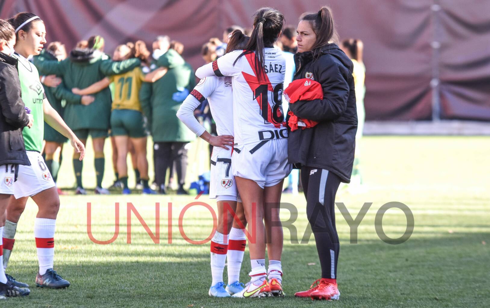 Las jugadoras del Rayo Femenino se dan apoyo en el césped de Vallecas tras perder 0-2 contra el Betis