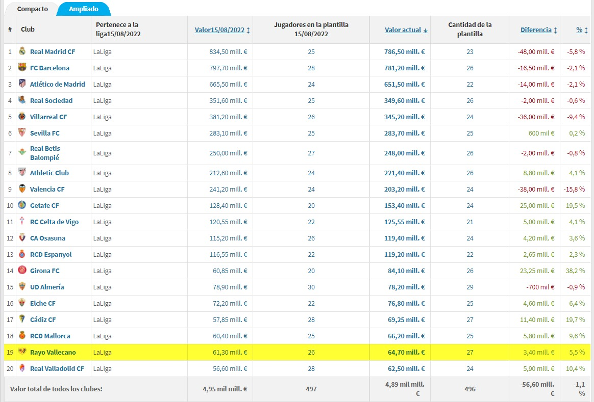 Tan solo el Rayo Vallecano es superado por el Real Valladolid. A continuación, os mostramos el resto de equipos en función de su valor: