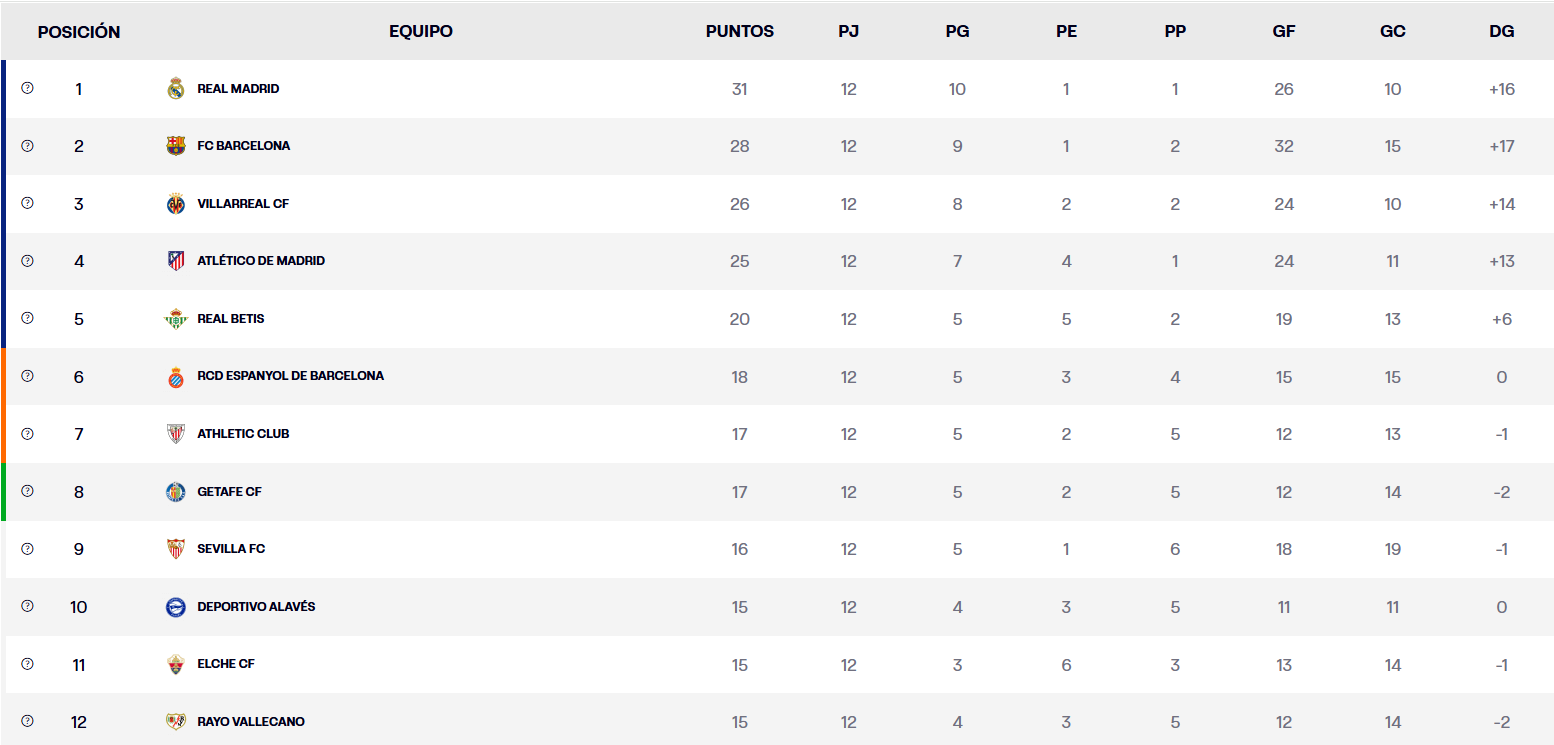 Clasificación de LaLiga 25/26. LALIGAEl Rayo Vallecano llega tras empatar a cero contra el Real Madrid el pasado domingo, 9 de noviembre, en el estadio de Vallecas. Con 15 puntos en la tabla, los pupilos de Iñigo Pérez se mantienen en la decimosegunda posición, a dos puntos del Getafe, que marca los puestos de Conference League. Los vallecanos buscarán su cuarta victoria a domicilio de la presente temporada para escalar posiciones en la clasificación.