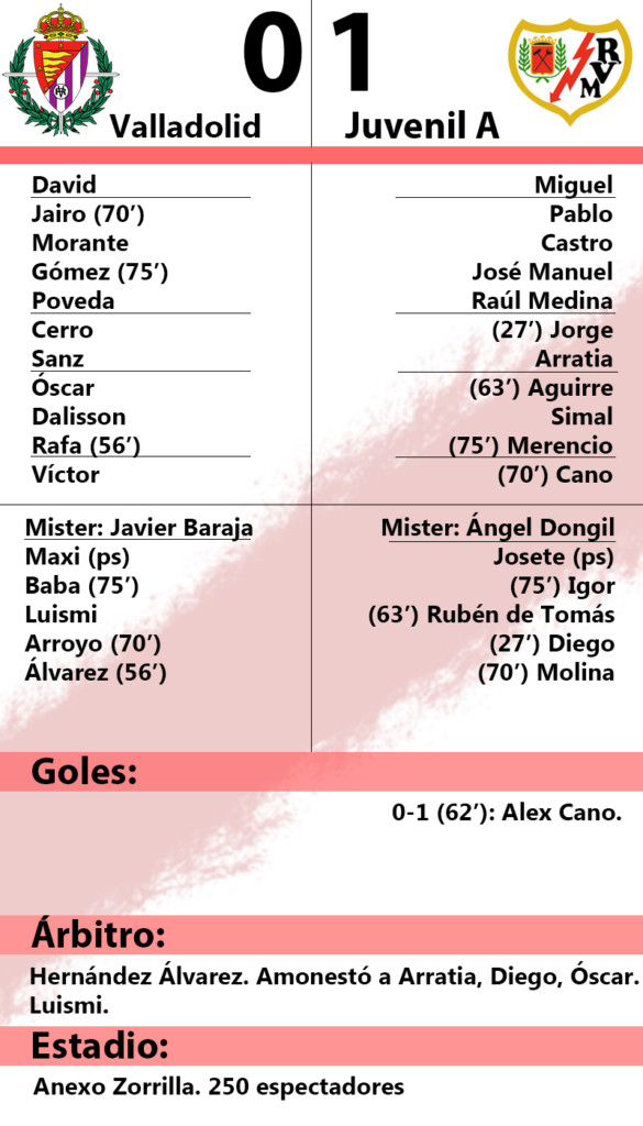 El gol rayista llegaría en el minuto 62 obra de Álex Cano tras una gran definición. Un tanto con el que el futbolista vallecano se quitaba la espinita del gol anulado minutos antes. En los minutos finales el juvenil A consiguió mantener el resultado cosechando así los tres puntos en el Anexo de Zorrila y dejando a ocho puntos a un conjunto directo como el Real Valladolid.
