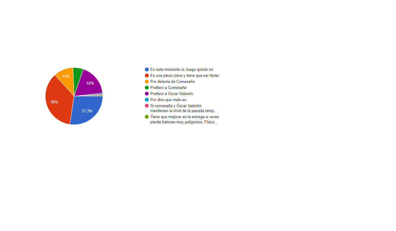Por otro lado el 18% de los encuestados piensa que tendría que ser titular Óscar Valentín. Otros aficionados, (el 11%) ven al senegalés por delante de Comesaña. No nos olvidamos del (5,8%), que creen que el gallego debería jugar cuando esté recuperado antes que Ciss.