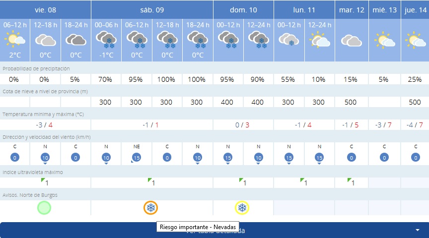 Según previsiones de la Agencia Estatal de Meterología (AEMT), habrá nevadas en la zona de Anduva desde la madrugada del viernes al sábado. Algo que permanecerá todo el día y que continuará el domingo con, lógicamente, temperaturas bajas en 0º y -1 C.