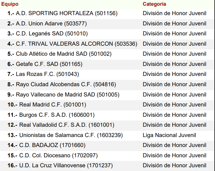 El Juvenil A formará parte del grupo V de la División de Honor Juvenil, se enfrentará a un total de 15 equipos: Real Madrid, Atlético de Madrid, Leganés, Villanovense, Valladolid, Badajoz, Burgos, Unionistas de Salamanca, Getafe, Sporting de Hortaleza, Diocesano, Unión Adarve, Las Rozas, Rayo Ciudad Alcobendas y Trival Valderas.