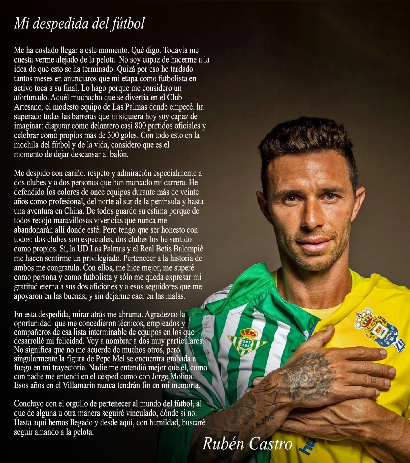 El exdelantero del Rayo Vallecano, Rubén Castro, se retira del fútbol profesional tras 763 partidos oficiales y más de 305 goles en su carrera deportiva.