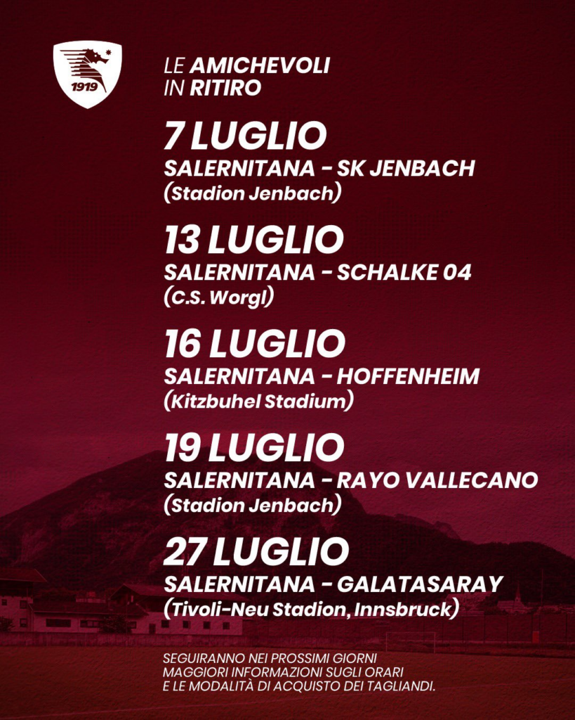 La Salernitana, equipo que recientemente milita en la Serie A, ha anunciado a través de sus redes sociales un nuevo amistoso de la pretemporada del Rayo Vallecano, a falta de confirmación oficial. Este partido se disputará el próximo 19 de julio en el Estadio SK Jenbach.