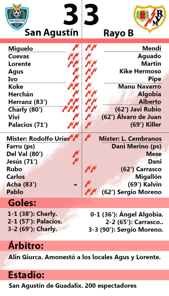 Dejando al margen lo estético, y centrándonos en el partido, Rayo B y San Agustín jugaron un partido atractivo para el espectador. El equipo de Rodolfo Urías planteó un partido incómodo apretando a los de Luis Cembranos en su propio campo; pero la calidad rayista le dejó trenzar alguna peligrosa jugada. Una de ellas fue la protagonizadas por Javi Rubio y Álvaro de Juan. Un cabezazo del ex del Atlético Madrileño estuvo cerca de abrir el marcador. Otro remate con la testa, en este caso de Charly, valió para que Mendi siguiera con su buena racha y realizara una gran parada. Era el presagio de una gran mañana para el extremo del San Agustín de Guadalix.