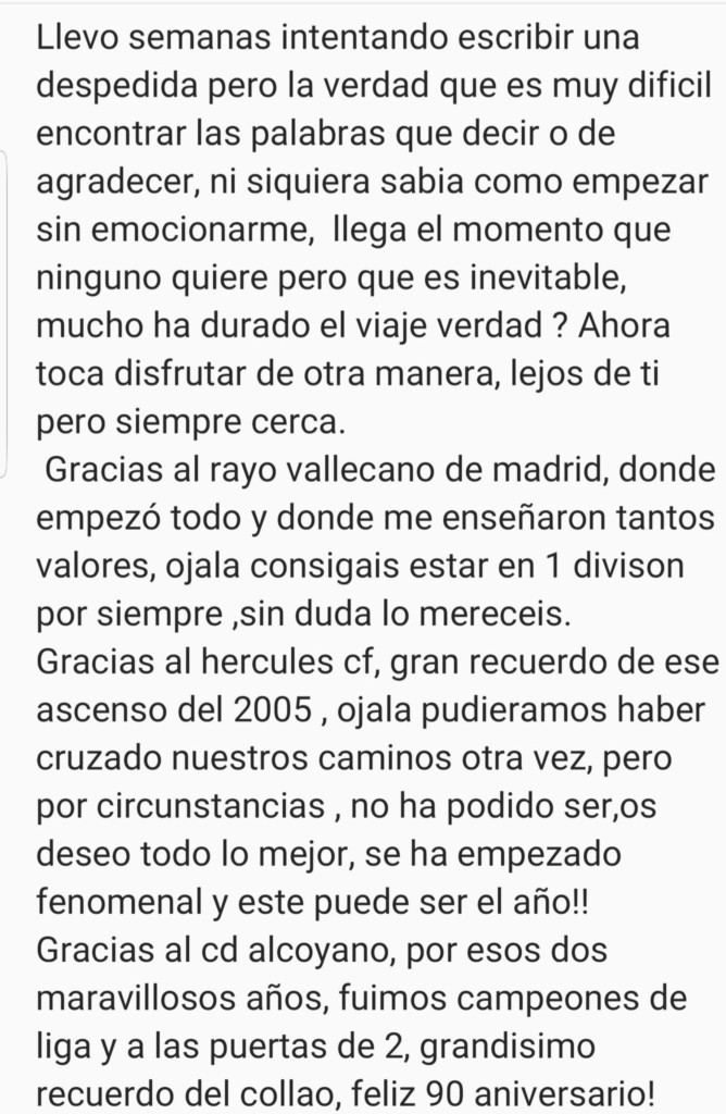 A sus 39 años recién cumplidos, y después de haber pasado por muchos equipos, como Alavés, Hércules, Getafe o Alcorcón, el mediocentro comunica que dejará de jugar al fútbol.