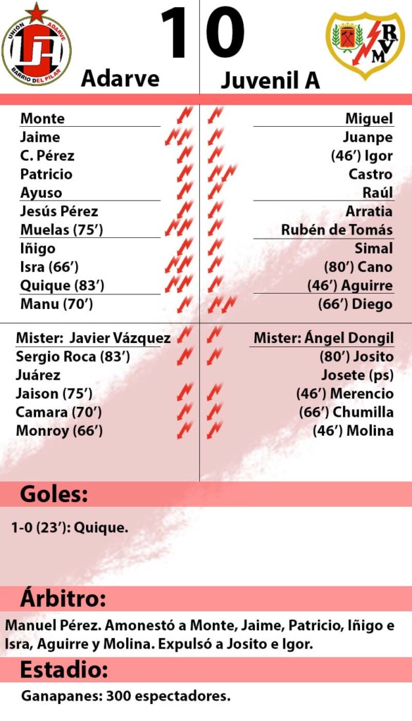 Es uno de los campos más difíciles de la categoría. Pequeñito y con un equipo de esos que sabe competir. El Unión Adarve fue superior en la mayor parte del encuentro y, finalmente, se llevó la victoria frente al Rayo Vallecano Juvenil A por 1-0 con gol de Isra.