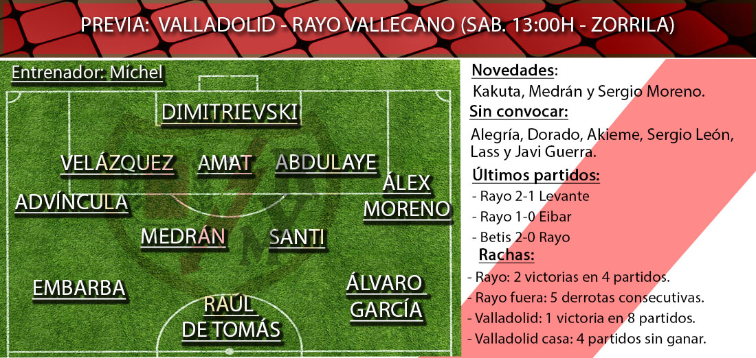 El técnico franjirrojo podría repetir el mismo once que doblegó al Levante en la última jornada de Liga, con la única novedad de Imbula, quien no viaja a Pucela al estar sancionado; su puesto podría ocuparlo Medrán. De este modo, el Rayo podría volver a jugar con defensa de cinco.