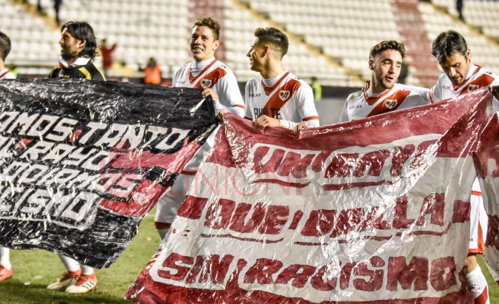 Por último, tras celebrar la victoria con la Vida Pirata, afición y equipo (sujetando las frases contra el rayismo), gritaron contra el Racismo entonando un ‘Es Racista el que no vote’.
