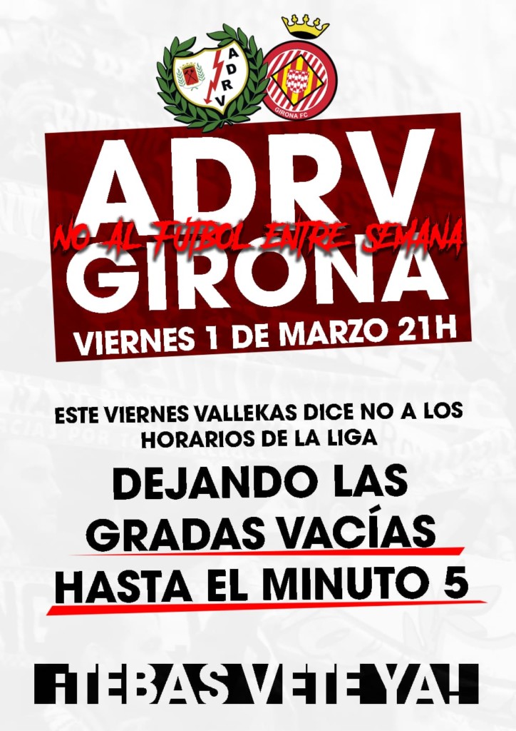 Las aficiones del Rayo, Girona, Leganés, Levante, Deportivo y Levante han lanzado un comunicado conjunto para protestar contra el fútbol entre semana.
